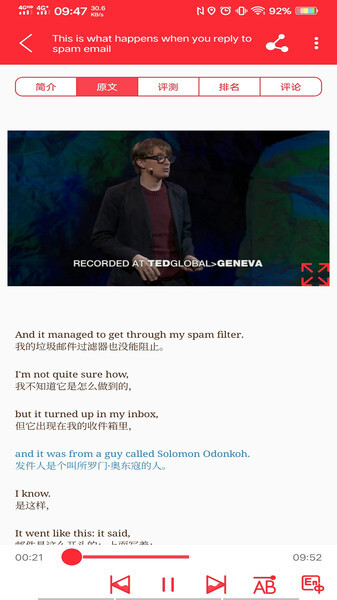 TED软件简介每天更新精选教育内容的TED演讲,中英双语字幕,实时跟读评测,并可以点击查询文中单词,功能强大,设计细致。为了帮助大家能在一个轻松、欢快的环境下学习英语,尤其是提高英语的听读能力。你可以轻松切换中英双语字幕观看TED演讲,调节字体颜色大小保护视力,跟读评测提升口语能力。让大家在聆听各个领域新奇思维的同时,快乐学习英语词汇,语法,用法。在提升思维能力,开阔眼界的同时,提升英语表达能力和感染力。
