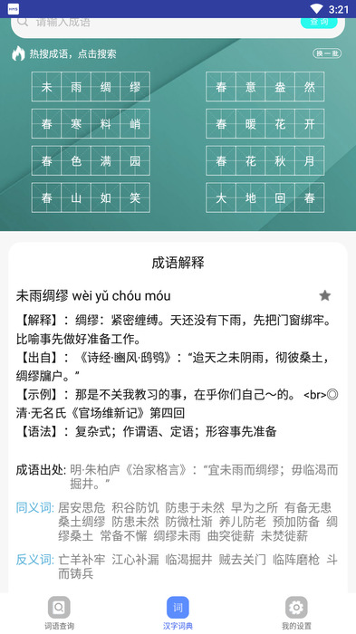 3.精心排版内容,提供成语同反义词查询,查询结果非常详细,保证孩子一看就会。
