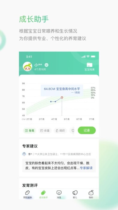 3、婴儿成长记录:记录婴儿身高、体重,见证宝宝成长的每一刻。