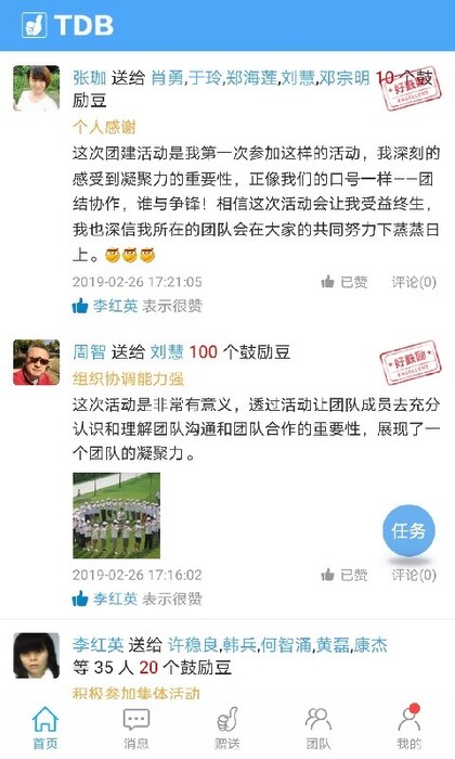 团队宝app是一款团队型软件,公司人多的时候,可以用这个进行对员工同事表示赞美鼓励等内容,使员工更有信心更有动力的工作,同时与同事之间还能点赞评论进行互动,让工作变得不枯燥没有动力。