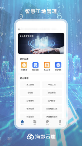 海数云建app是一款非常智能专业的项目综合管理软件,在这里能够呈现多元化的管理平台,所有业务和项目都能全面来协调,人员精细化管理,保存大家的个人信息,提供丰富功能随时都都可以进行数字化管理。海数云建app能够非常精细的管理工程中的人员,为用户带来更加完美的智能管理。为用户带来更便捷的项目管理体验,各种数据尽在其中,还有工程申报、质量管理以及安全管理等功能,如果你想要数字化管理,打造智慧工地,工程全面覆盖,就来下载吧!