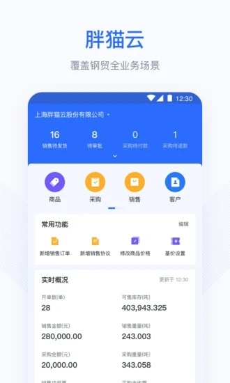 胖猫云APP是一款钢铁贸易企业业务管理软件。该平台全覆盖钢贸经营场景,产业与金融高效融合,用户可轻松管理钢贸业务。依托多年钢铁贸易行业经验,深入了解用户交易场景。胖猫云APP满足各种中小型钢材贸易场景。胖猫云APP还支持现货采购和销售,支持销定采,支持预售期货,支持终端配送等交易模式。购买不同的交易场景。销售、库存、财务模块清晰易懂,全场景业务控制清晰易懂。如果你也对这款APP感兴趣的话,那就快来下载试试吧!
