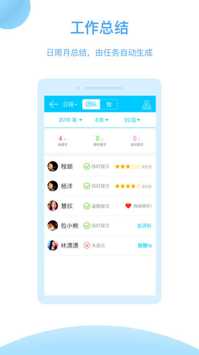 3、支持工作、总结、登录的日常数据汇总;支持项目、考核等更多企业数据统计;数据汇总支持邮件和短信订阅。