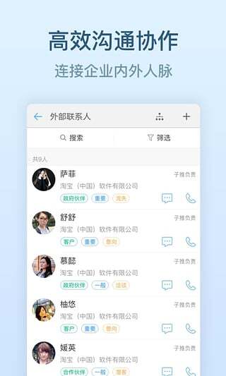 5、统一通讯:企业或团队组织,内外联系人组织结构统一管理,一目了然,随时随地快速找到人。