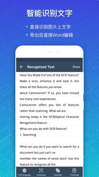OCR技术是扫描全能王的核心功能。对于整个文档OCR只需输入图片或文档中的关键词,就可以快速找到包含此关键词的文档,高级账户还可以直接将图片上的文本转换为文本导出。