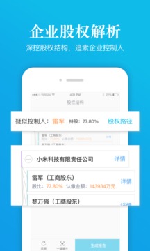 启信宝企业信用查询介绍启信宝企业信用查询是一款快速准确的启信宝企业信用查询工具,为各界人士提供丰富详细的企业信息检索。启信宝软件特别可以帮助金融从业者、律师、投资者、媒体记者、销售管理等专业商务人士提供全面、客观、权威的工商、投资、司法拍卖、资质、许可、处罚等企业信息。下载启信宝手机版是各界商务人士必备的企业信息查询工具。