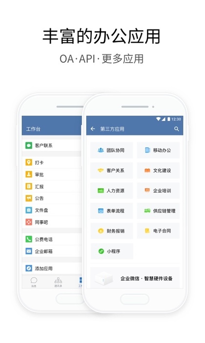 企业微信app下载安装安卓版介绍企业微信app下载安装安卓版是腾讯公司微信团队为企业打造的高效办公软件,能够帮助企业快速管理微信,移动办公已成为企业办公的新思路。企业微信app下载安装安卓版下载的设计思路是针对企业用户的自动化办公协作,只有企业员工关注企业号,而且需要经后台管理员审核通过后方可使用,最新发布的企业微信app包含了与微信一致的沟通体验、丰富OA应用和连接微信生态的能力,帮助企业有效沟通与管理,企业微信已被中国工信部、中国银行、长安集团、阳光保险、韵达速递、欧普照明、云南白药、太古集团、中粮糖业、链家集团、南方航空等百万知名企业组织使用企业微信。