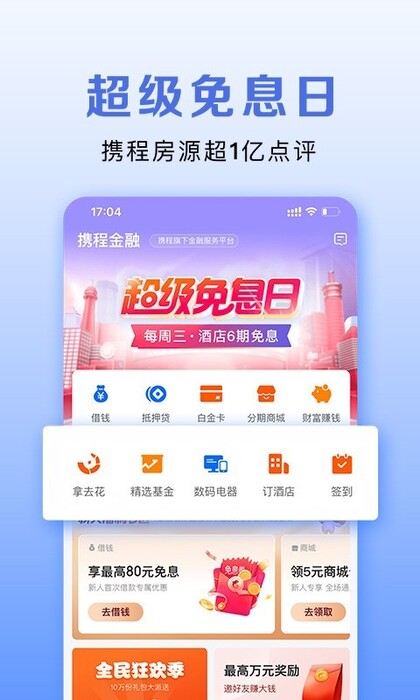 携程金融下载手机版app特色1.【轻松借钱】可高达20万,审批方便,年综合费率可低至7.2%