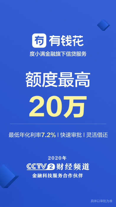 有钱花最新app是百度旗下的借贷软件。在这里,您可以快速申请贷款产品使用,这样您就不用担心贷款了。有钱花最新app安全可靠,手续费很低,还款方便,该软件可以充分利用百度人工智能和大数据风险控制技术,为用户带来便利。快捷、安心的互联网信贷等优质服务,快来下载有钱花最新app,在这里你可以享受到最专业的借款服务,更有专业的24小时在线客服随时为你解答疑惑哦!