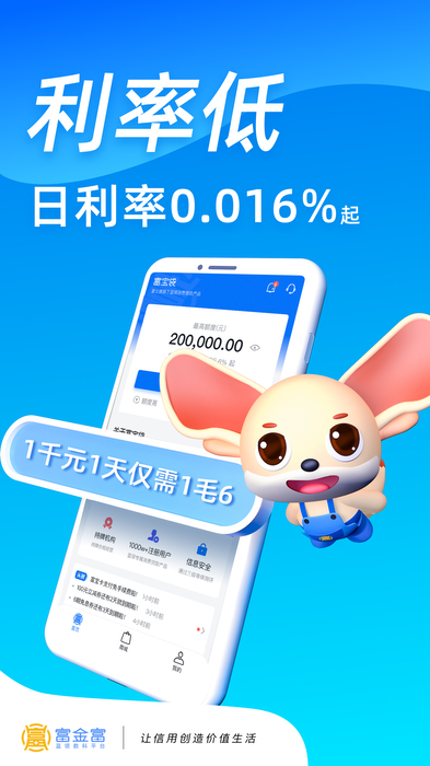 富宝袋app简介富宝袋APP是富士康富金富蓝领数学平台根据个人信用打造的消费贷款分期产品。用户可以通过富宝袋在线申请虚拟信用额度,实现消费分期付款、现金提现、支付钱包等功能。消费45天免息,金额10万!