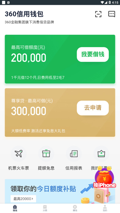 信用钱包app是360金融旗下的消费金融平台,具有分期购买、分期贷款等服务,提供正规、方便、省心、大品牌的信用生活。信用钱包app针对广大用户急需花钱,花钱难的问题,提供分期购买、分期借、贷款等服务,您消费时,为您买单,让您随时随地都可以预先消费,无需任何实物抵押,只要您的信用良好,就可以享受极速贷款。信用钱包app,大品牌,值得信赖。