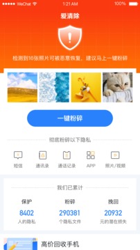 爱清除APP测评1、一键深度粉碎,只要打开隐私粉碎功能,就可以从根本上彻底清除隐私数据和信息。