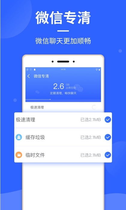 2、能快速实现微信专清,对微信的垃圾实时在线处理。