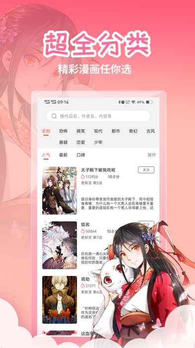 5、按漫画类型分类、归纳、排序,让您随时按分类搜索小说。