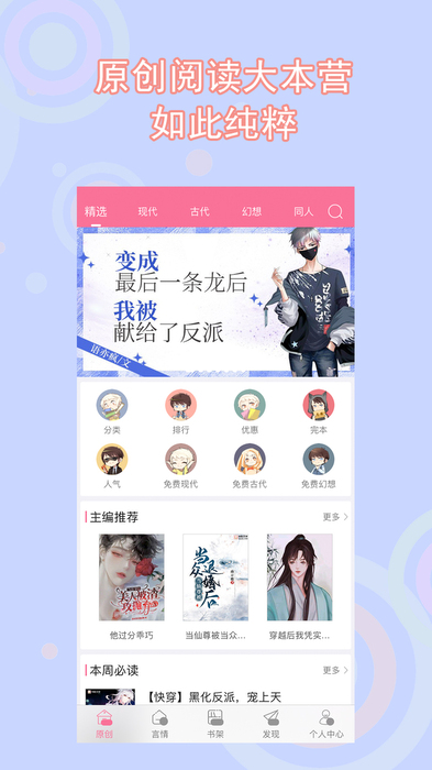 书耽app是一款专为广大女生小说爱好者打造的阅读软件。这里有各种耿美题材的小说,如古代、现代、校园、青春、快穿、架空、爽文、武侠、玄幻、穿越、重生、百合等等应有尽有。在这里,用户还可以互相交流相关书籍,一起吐槽、评论等,非常贴心高质量。如果你也喜欢看小说,那就快来将书耽app下载到手机上试试看,在这里为你准备的小说资源是很丰富的,更有强大的搜索功能,让你可以轻松找到自己喜欢的进行阅读,是你不可以多的的追书神器哦!