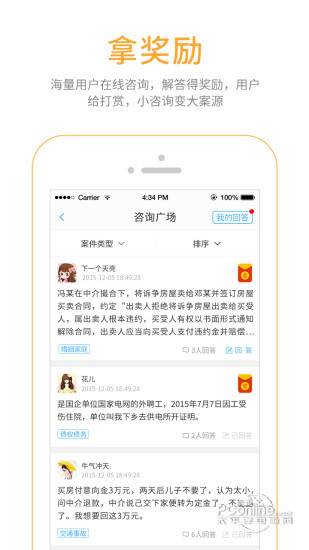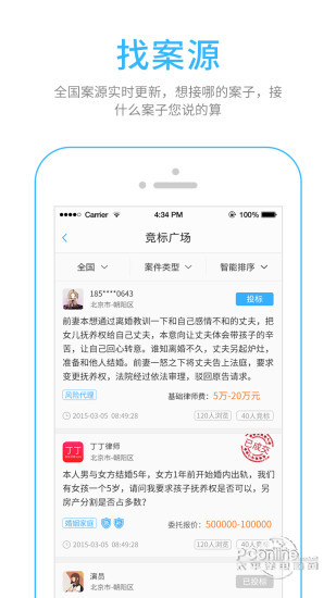 律师起步难、案源少、当事人拖欠律师费,怎么破? 丁丁律师,是一款整合律师和当事人资源,快速问律师,为律师提供大量案源、人际知识储备的应用。当事人在平台上提交法律问题以后,平台会通过向律师端发送短信,提醒律师在线解答。律师通过和当事人的沟通,获得自己需要的案源。同时,我们将建成一个大数据案例分析平台,供律师查阅。在“丁丁律师”的平台,聚集了全国各地的优秀律师资源,这里可以成为圈内的人脉拓展地。案源+人脉+大数据精准化=丁丁律师