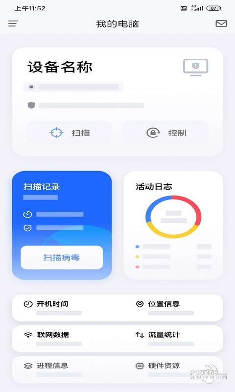 2.一部手机可以实时关注多台电脑的状态,例如:活动日志、开机时间、CPU/内存使用情况、网络连接、流量统计、进程信息等信息。