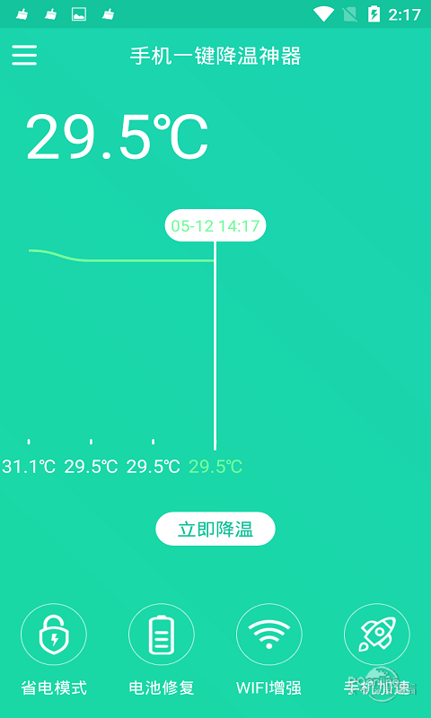 手机一键降温神器可以实时检测手机的温度情况,让你对手机的温度了如指掌.一键关闭发热应用,降低CPU能耗,让手机恢复正常温度,一键降温再也不用担心玩游戏、充电的时候手机烫手了.