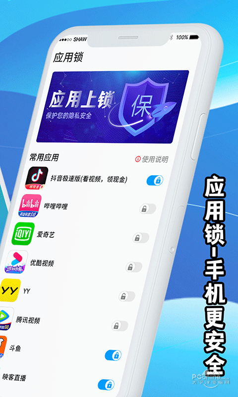 一个可以为手机上各种安卓应用上锁的app应用锁工具,牢牢锁住你的隐私,一键锁屏,快捷上锁,安全贴心,是一个让你值得信赖的隐私卫士,你的手机安全管家.