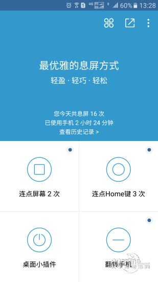 超优雅的息屏方式,解放你的电源键。小而美,简单而实用。共五个功能,随意组合,随心所欲: 1. 连点屏幕息屏 2. 连点Home键息屏 3. 桌面小插件 4. 翻转手机自动息屏 5. 帮您记录每天使用手机的总时间。减少辐射,保护眼睛,每天到底要玩多久手机,赶紧来瞧瞧吧。 有任何建议或意见欢迎联系: 邮箱:379429459@qq.com QQ交流群: 252408582 感谢支持哦~~~ 【注意】某些系统上无法直接卸载本软件,在软件主界面的菜单中有卸载按钮,请点击卸载。