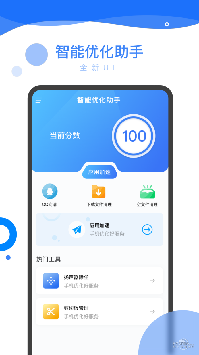 智能优化助手是一款Android端手机优化软件,有一键优化、QQ垃圾专清、下载文件清理、剪切板管理、扬声器除尘、应用加速等功能,只需轻轻点击即可清理手机垃圾、释放手机内存、一键提升手机性能,提升应用运行效率,帮你告别卡顿响应慢等问题,是优化手机的智能好帮手