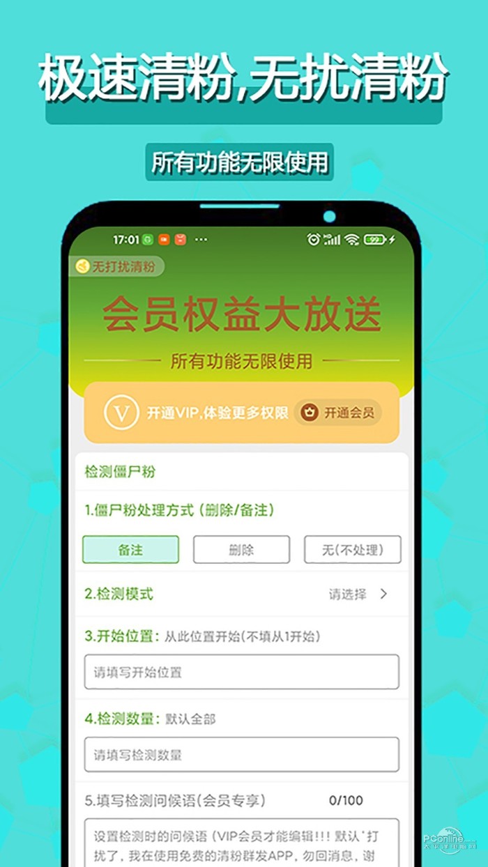 急速清粉,无扰清粉,清理单向好友,轻松解决僵尸粉问题.群内加好友,自动添加群内好友,可自定义招呼语,以及备注信息,操作简单易上手.朋友圈一键转发,自动点赞评论,解放双手,微商营销的好帮手.