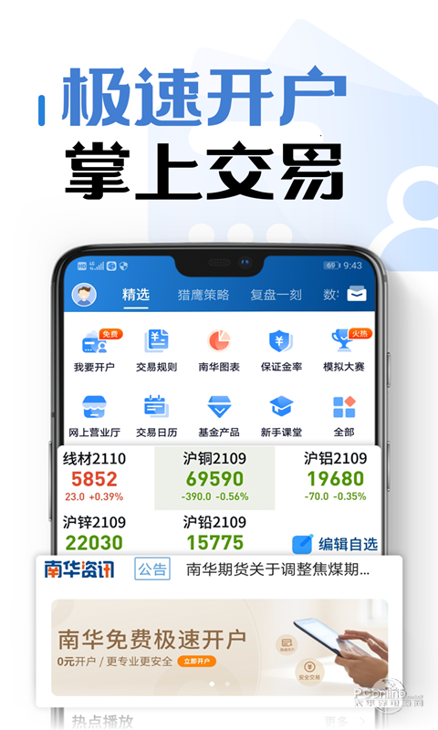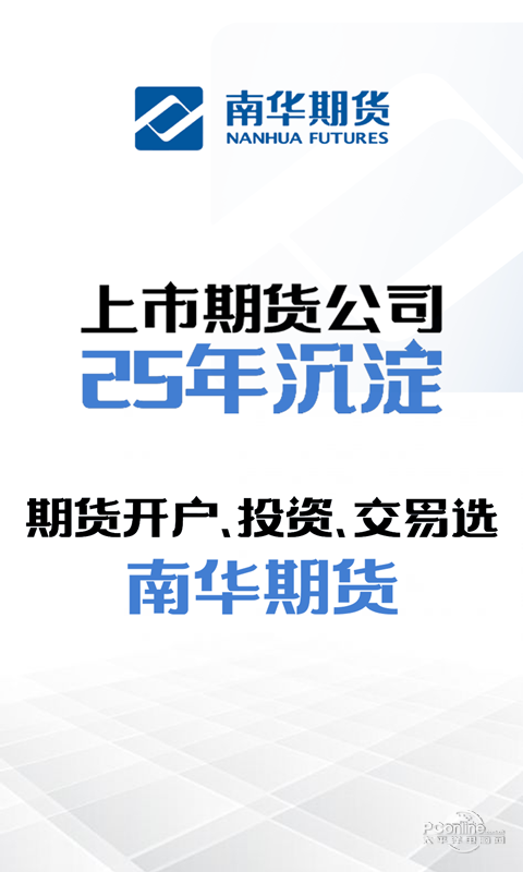 南华期货是国内主板上市期货公司(股票代码:603093 ),为投资者提供一站式财富增值平台.南华期货APP为您提供全方位期货行情、线上极速交易、手机在线开户、权威资讯内容,是期货投资者首xuan期货软件.