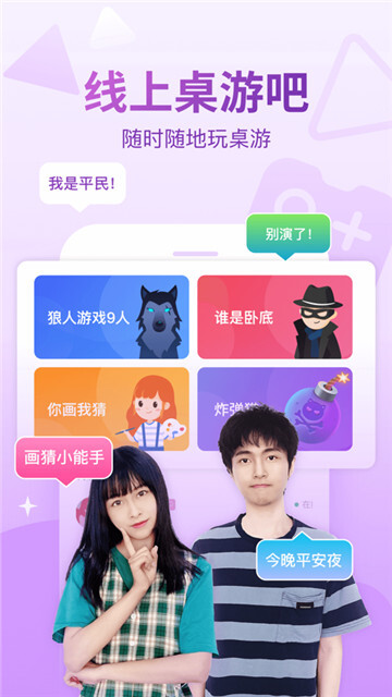 「狼人游戏」线下组局人不够?来“会玩”语音房,千万玩友在线联机,全程烧脑,期待一场真相与谎言的逻辑推理大作战!「你画我猜」随手涂鸦,互动解谜,你永远不知道会遇 见什么样的灵魂画手 ;「谁是卧底」《快乐大本营》最爱玩的明星互动游戏,线上也能玩啦,快来和卧底伙伴们大战300回合吧!