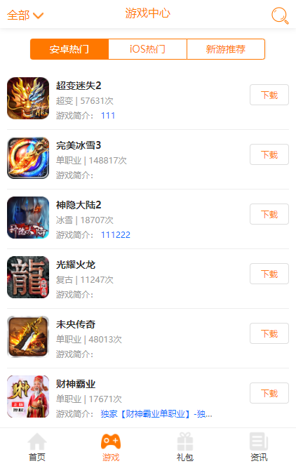 1000f传奇手游盒子app介绍1000f传奇盒子app是一款拥有大量资源的传奇手机游戏盒。这里有各种你想要的传奇资源,这里有各种各样的好处,无论是复古打金还是变态爆炸。只要你下载它们,甚至可以免费送。新版本在没有捐赠的情况下在线开放,这个传奇游戏没有切割,这个小怪也可以爆炸。各种各样的传奇都聚集在这里,叫上最喜欢的兄弟,来下载吧!