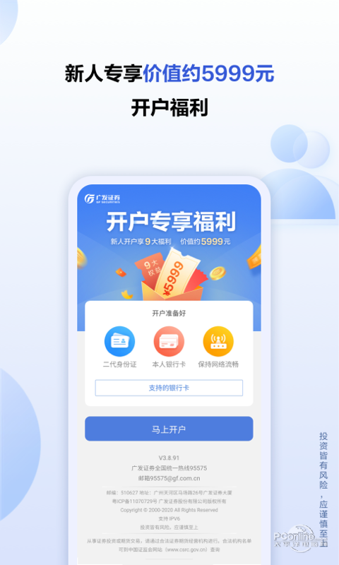 广发证券开户尊享版,是广发证券为用户打造的一站式股票开户及咨询平台.股票自助开户最快只需3分钟、操作简单、信息安全,7*24小时可申请.开户过程中,理财顾问全程陪伴.开户后,广发证券7000余名理财顾问将7*24小时在线秒速响应您的任何疑问,尊享“一对一”专业答疑.