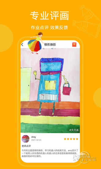 你好,欢迎加入天天画。天天画是一款线上美术教学应用,定位青少年群体。通过订阅美院名师视频课程,让孩子享受专业的绘画知识。“点亮想象、培养审美、树立自信”是我们的教学理念; 天天画提供以下内容和服务:【精品课程】 名师团队精心打造的系列课程,满足青少年不同层次的需求。内容包括变变变思维美术、绘本原创美术、创意手工、百科通识、艺术启蒙、中外美育,国画书法,油画创作等,内容形式丰富,可自由订阅。【想象力视频】精心打造的想象力短视频,轻松体验变变变理念,点亮孩子的想象力。【评画辅导】 课后上传作品,老师1对1评画辅导,365天有老师陪伴,进步更快。【绘画成果】 每一幅作品都有老师的专业点评,作品永久保存,拥有专属艺术档案。【专业测评】 依据孩子年龄和绘画水平定期进行专业测评,针对性推荐适合孩子的趣味性教学课程,让每一点进步都清晰可见。