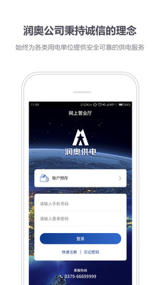 4.润奥供电app提供移动终端服务窗口,涵盖用户注册、配电业务和购售电业务。为电力用户提供方便、安全的移动服务。用户可以随时随地自助申请用电,充值和支付。