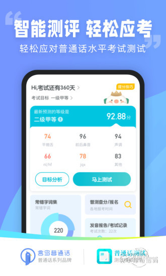 千万用户口碑推荐产品,普通话等级考试一站通关神器!普通话测试APP,言鸟普通话品牌旗下产品,为准备全国普通话水平测试考试的用户服务。【2000万普友的选择】无论你是想要考取教师资格证,还是播音主持、配音表演等与声音密切有关的职业,都需要普通话等级证书和流利标准的普通话。2022年一起考教师,通过普通话二级甲等、一级乙等就是这么简单,说一口流利普通话! 1.普通话发音测试普通话测试APP功能,纠正发音巩固练习,提高普通话学习效率。全真试题,AI智能语音技术模拟正式普通话考试,为参加普通话水平测试打好基础。 2.普通话测试,发音练习,取长补短测试都附有错误分析,帮你指出普通话发音及口音问题。还有“常错字词集” 3.普通话分数排行榜系统依据拼音声调读音、声母、韵母、轻声词、儿话词等综合统计出普通话测试分数排行榜,排名前列的用户将获得普通话课程等奖励。 4.普通话练习社区普通话测试APP社区玩法升级,短文朗读、命题说话、考试经验、练绕口令、教资考试等多个普通话学习版块,分享和交流普通话学习客服qq:947348662 微信服务号:言鸟普通话(yanniaoputonghua)