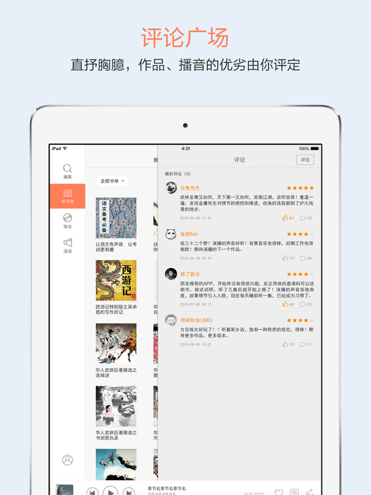3、正版质量:丰富正版有声资源,优秀新演播,经典新作,饱耳福。