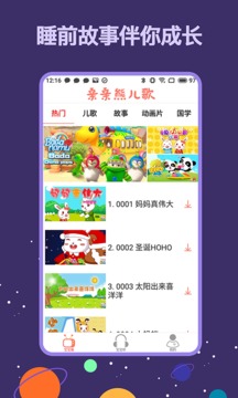 亲亲熊儿歌APP内容1、每日更新:每天都有新的儿歌、睡前故事、童谣童话、有声读物、儿童童年益智启蒙伙伴。