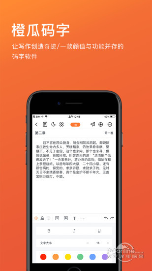 橙瓜码字专为网络作者量身打造的灵感启发码字软件,其功能有灵感启发、写作素材库、灵感随笔、实时同步、起名助手、大纲助手、稿费预测、时光机、离线备份、拼字比赛等等功能,拥有在线备份与离线备份双重备份机制,保证用户不丢稿。 软件亮点, 1.实用强大的码字功能,多端同步备份、时光机稿件找回、在线拼字、文字校对、大纲助手、起名助手等各种功能让写小说不再困难 2.投稿征文专区,20多家主流小说网站联合征文收稿,近1000位编辑看稿签书,投稿选择更多,签约成功率更大,实现更大作品价值 3.网文圈海量热心作者,多年从业评稿团交流创作指导,知名大神作家讲课,让写作水平不断得到提升 支持云端备份、多端同步、文字校对、灵感随笔、大纲助手、在线拼字、敏感词检测、一键排版、皮肤更换、稿费预测等众多特色功能
