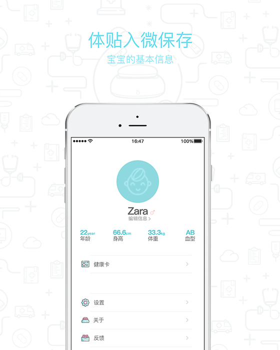 2、基本信息,本软件上显示婴儿的基本情况,包括年龄、身高、体重、血型、健康状况、体温、活动次数、湿热指数等。