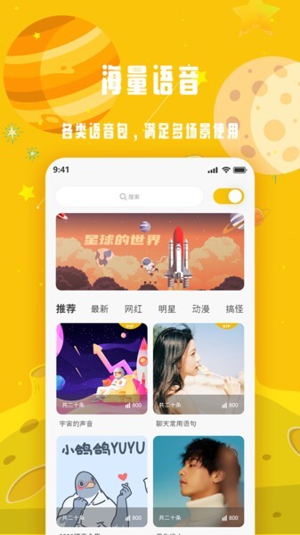 变声星球优势1、您可以直接在搜索栏中搜索并使用许多免费语音包,在这里挑选自己喜欢的进行使用。