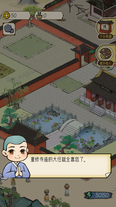 出家模拟器游戏玩法1、参与寺庙建设:早期的寺庙很简单,但是如果你用心经营,参与建设,寺庙就会重新修复变得更好。