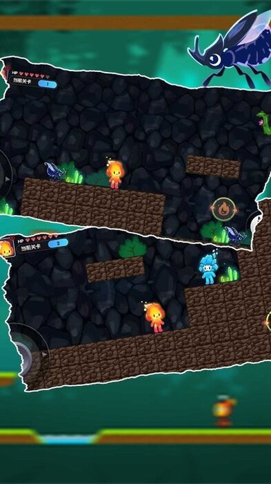 4、帮小红人找到蓝冰人,穿越森林,躲避或打败敌人,一起安全回家。