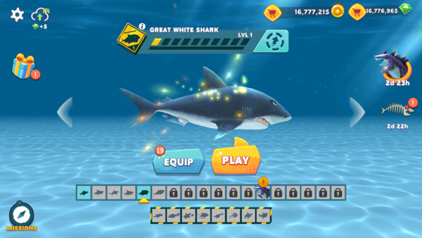 4.完成50项任务,寻找宝藏,获得升级鲨鱼或购买特殊救生道具的金币和宝石。