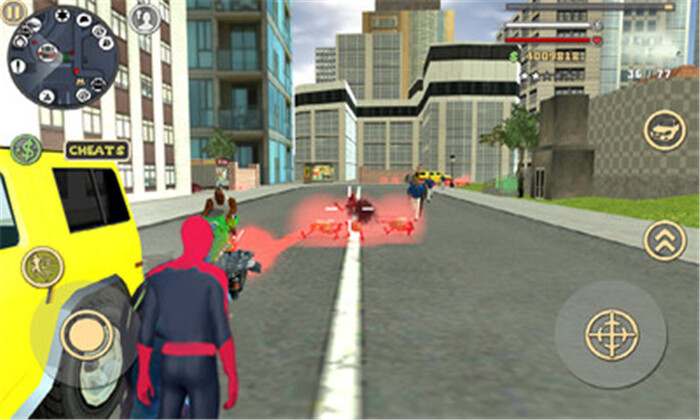 2、这个游戏的操作很简单。玩家只需点击左右移动按钮就可以控制蜘蛛侠的移动方向。玩家也可以切换成摇杆,点击蜘蛛网图标发射蜘蛛网,穿梭城市,点击射击按钮用武器射击敌人。