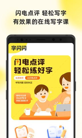 字闪闪app下载完成可以发现这是一款写字练字的软件,用户使用该软件学习在线写作课程,参加课程学习更多汉字,根据课程安排练习写作,智能AI老师会自动修改用户的拼写,让用户写出好汉字,这有助于孩子写出好的语,一手好字给人很好的第一印象,更好地体现孩子的气质,在这里将从基本课程开始,为写一个好字提供各种写作课程。字闪闪安卓最新版下载后致力于做有效的在线写作课程,让孩子们轻松练好字!课程内容循序渐进,主讲老师闪电点评,书写问题实时纠正,练习270个字掌握3000个字。