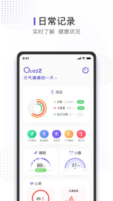 2.QuzzZ手机安卓版可以帮助你记录心率、血氧和睡眠数据,这些数据可以直观地显示你的健康状况。