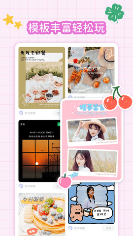 【创意十足的模板】 不断更新的精美模板,无论是杂志风、可爱风、还是咕卡拼贴,都可以一键套用,为您免去设计排版的烦恼。