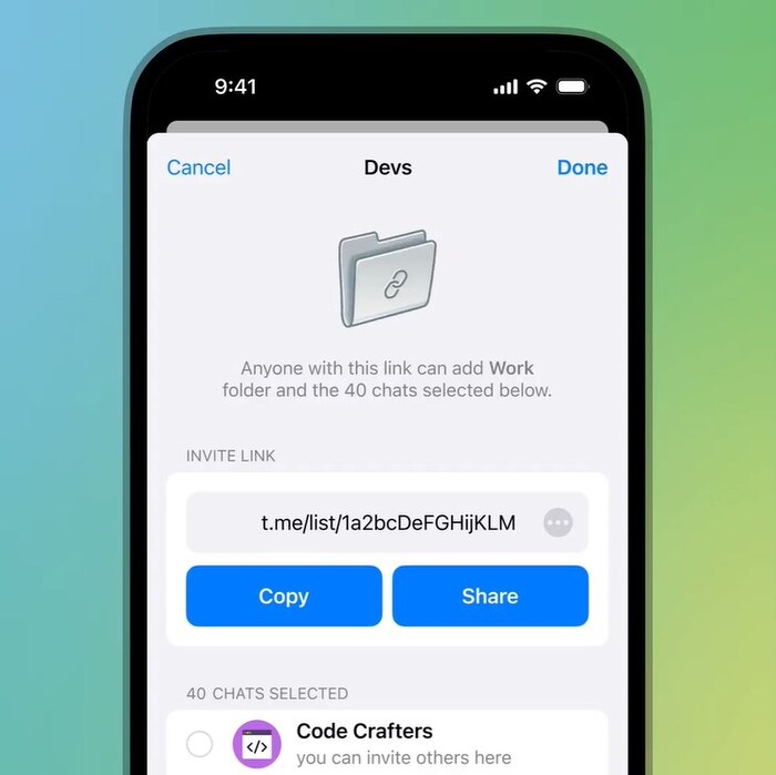 2.如果您向文件夹添加更多聊天并更新其链接,成员将看到加入新聊天的建议。