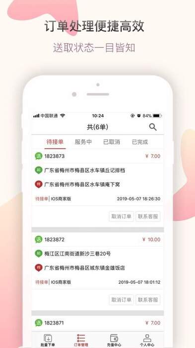 帮啦跑腿商家端app的介绍1.订单管理:商家可以通过该功能发布收送货物的订单,也可以查看自己的历史订单记录。