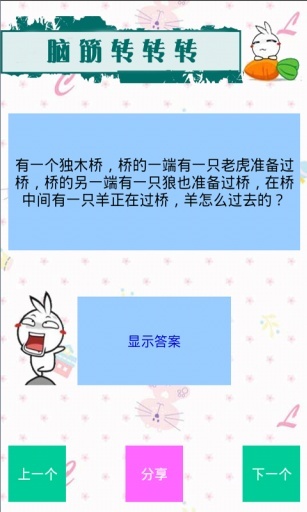 单机脑筋急转弯手游的介绍1.在单机脑筋急转弯官方安卓版中,玩家需要迅速思考,猜出题目和谜语的答案,考验玩家的逻辑思考和语言表达能力。