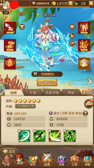 2、游戏界面及图标美术升级,包含英雄、外观、神器、背包、公会副本、召唤、锻造、创角等主要界面及图标,带来全新视觉效果