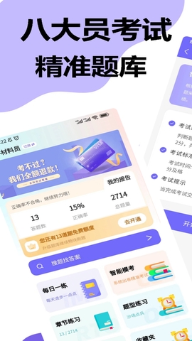 八大员考试精准题库软件特色1.全面涵盖考试内容:该app提供全面覆盖建筑八大员考试内容的题库,包括工程造价、工程施工、工程质量、工程安全、工程质量、工程监理、法律法规等多个方面的知识点。